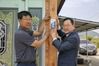 명현관 해남군수(오르쪽)가 5·18당시 부상당한 해남읍 최재철씨 가정을 방문해 명패를 달고 있다.(사진제공=해남군) |