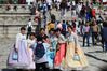 한복을 차려입고 경복궁을 방문한 외국인 관광객들이 기념 촬영을 하고 있다. / 이준헌 기자 |