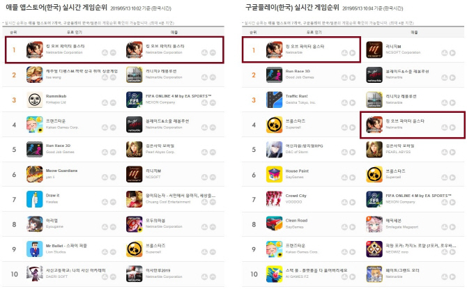 13일 넷마블은 모바일 앱 마켓 분석사이트 게볼루션을 인용, 이날 오전 KOF 올스타가 애플 앱스토어 최고매출 1위, 구글 플레이 매출 4위를 기록 중이라고 밝혔다. 인기순위는 나란히 1위다.