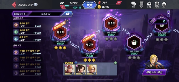국내 론칭과 함께 준비된 타임 서바이벌과 에픽 퀘스트는 게임의 백미다. 타임 서바이벌은 주어진 파이터와 내가 가진 캐릭터를 사용해 플레이하는 콘텐츠가 준비됐다. 타임 서바이벌 콘텐츠의 경우 내가 가지지 못한 캐릭터를 미리 만나보는 재미까지 제공한다. 특히, 1초라도 시간을 줄이기 위해 수동으로 조작하는 재미가 살아있는 콘텐츠다. 에픽 퀘스트도 마찬가지로 수동조작이 중요하며, 일종의 공략 콘텐츠다. 전투에 돌입하기 전부터 고민을 거쳐 클리어하는 재미가 살아 있다.