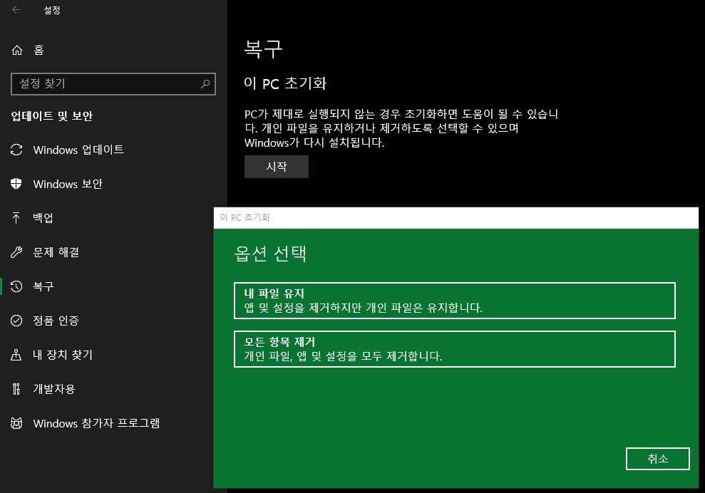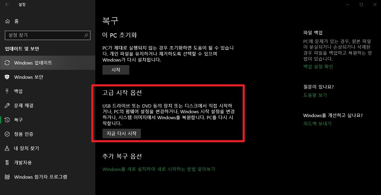 시작 > 설정 > 업데이트 및 보안 > 복구