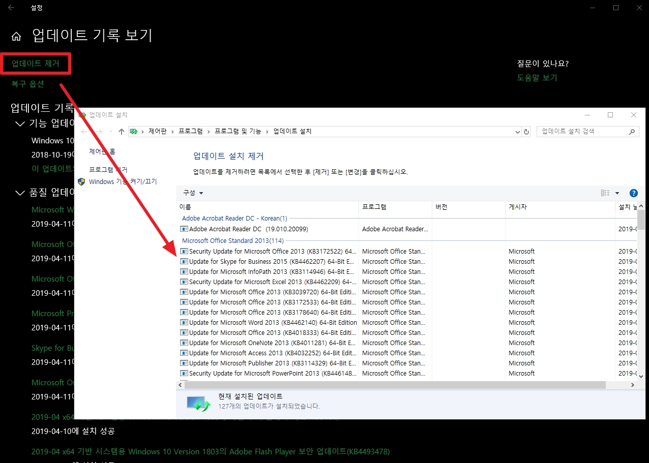 최근 업데이트를 제거하는 다른 방법이 있으므로 모든 업데이트가 손상되지 않아도 된다. 설정에서 업데이트 및 보안으로 이동한 다음 윈도우 업데이트로 이동한다. 업데이트 기록보기 링크를 클릭한 다음 업데이트 제거를 클릭하라.