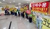 이들 주민은 행사 30분 전부터 대강당 입구를 막고 '3기 신도시 철회하라', '강제수용 결사반대', '국토부는 땅장사 중단하라' 등이 적힌 피켓을 들고 구호를 외치며 행사 저지에 나섰다.