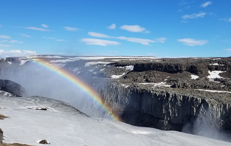 아이슬란드는 불(화산·용암)과 얼음(빙하)의 나라라고 한다. 나는 폭포를 추가하고 싶다. 손 때 묻지 않은 날 것 그대로의 폭포가 저마다의 개성을 뽐낸다. 방문한 10여 곳을 하나하나 곱씹고 싶지만 여기선 귀들포스(Gullfoss)와 데티포스, 고다포스 세 곳만 소개한다. 귀들포스는 수도 레이캬비크와 가깝다. 차로 한 시간 달리면 너끈히 닿는다. 지리적 이점 덕택에 여행객이 가장 많이 다녀간다고 한다. 하염없이 떨어지는 폭포수 사이에 떠오른 무지개가 신비롭다. 가만히 앉아 10여분 동안 물줄기만 바라본다. 오랜 세월 사람들과 부대끼며 가슴 깊숙이 박힌 애증의 덩어리가 뽑혀나가는 느낌이다. 진입도로가 종종 폐쇄되는 터라 운이 좋아야 볼 수 있다는 데티포스를 만나는 행운도 누렸다. 방문 전날만 해도 진입도로 2곳(862·864번 도로)이 모두 며칠간 내린 비 탓에 홍수 우려로 폐쇄된 터라 마음을 접었으나 다음 날 아침 862번 도로가 뚫렸다. 데티포스는 접근이 어려운 만큼 야생의 맛이 강렬하다. 영화 <프로메테우스>(2012) 오프닝에 원시 지구의 한 모습으로 등장한다. 나 역시 문명인이 아닌 자연인이 된 착각이 들었다. 폭포 서쪽 편 진입로(862번)에선 폭포를 위에서 아래로 내려다볼 수 있고, 동쪽 편 진입로(864번)에선 아래에서 위로 감상할 수 있다. 고다포스는 게으른 여행객에게 안성맞춤이다. 링로드와 붙어 있어서다. 비포장도로를 달리는 수고 없이 웅장하고 아름다운 경치를 즐길 수 있다.