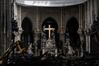프랑스 파리의 노트르담 대성당 화재 발생 1개월을 맞은 15일(현지시간) 관계자들이 무선 조종 장비를 이용해 까맣게 그을리고 파손된 재단 주변 잔해를 정리하고 있는 가운데 큰 훼손을 면한 피에타 상 너머 황급색 십자가가 여전히 빛나고 있다. 지난 4월 15일 발생한 대형 화재로 850년 역사의 성당의 지붕 구조물과 고딕양식을 대표하는 첨탑이 소실되었다. AP 연합뉴스 |