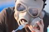 14일 광화문광장에서 열린 '미세먼지 속의 다이닝'행사에서 참석자가 마스크를 쓰고 식사를 하는 모습. 사진 = 연합뉴스 |