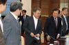 문재인 대통령이 20일 청와대 여민관에서 수석·보좌관 회의를 주재하기에 앞서 참모들의 인사를 받으며 자리에 앉고 있다. 청와대사진기자단 |