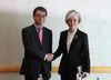 강경화 외교부 장관과 고노 다로 일본 외무상이 지난 2월 15일(현지시간) 독일에서 한일 외교장관 회담을 갖고 악수하고 있다. (사진= 연합뉴스) |