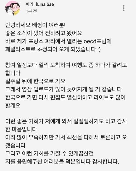 뷰티 크리에이터로 알려진 유튜버 배리나(본명 배은정·사진)씨가 OECD 포럼에 패널로 참석했다는 사실이 알려지자 누리꾼들이 의혹을 제기했다. 이에 배씨는 적극 해명했다.