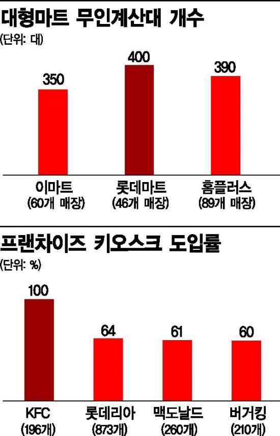 29일 관련 업계에 따르면 현재 대형마트 3사가 운영하는 무인계산대만 전국에 1000대를 넘어선 것으로 나타났다. 이마트가 60개 매장에서 350여대를, 롯데마트가 46개 매장서 400여대를 도입했다. 홈플러스는 89개 점포에서 390대를 운영해 총 1140대가 전국에서 운영 중이다.