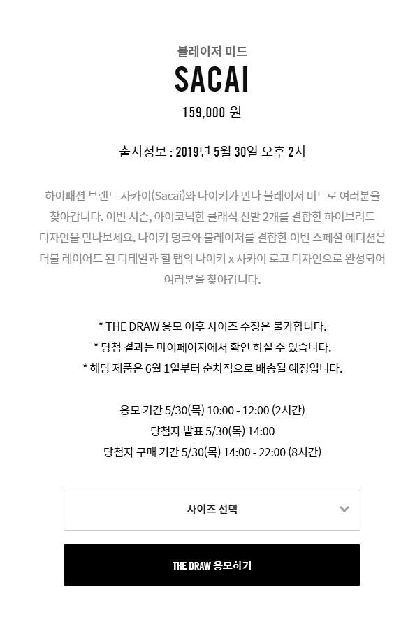 이날 나이키 온라인 스토어에서는 나이키 사카이 블레이저 미드의 드로우(추첨) 응모를 진행한다. 드로우 응모는 온라인 상 추첨 시스템이다.
