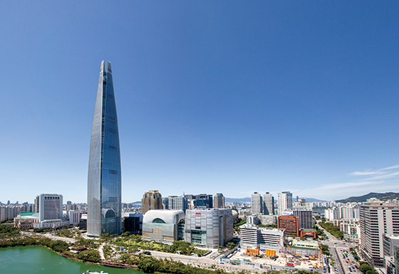 타워 높이 555m, 지상 123층 규모의 롯데월드타워는 롯데그룹이 4조2000억원을 투자해 만든 수직도시다. 국내에선 하늘과 가장 가까운 빌딩으로, 연면적만 80만5000㎡로 축구장 약 115개 크기에 이른다. 내부에는 최고급 주거시설, 최첨단 업무시설 그리고 국내 최고 쇼핑몰이 한곳에 집약돼 원스톱으로 모든 것을 누릴 수 있다. 주거, 상업, 쇼핑시설이 한곳에 모여 생활 편의성을 높이며 주거복합단지의 수준을 한 차원 높였다는 평가다.