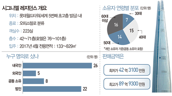 다만 해당 오피스텔이 최소 40억원 이상 하는 만큼 계약시점과 등기시점 간 시차를 감안해야 한다는 분석도 나온다. 분양과 관리를 담당하고 있는 롯데물산 관계자는 “워낙 고액이라 중도금과 잔금 등을 6개월에 걸쳐 납부하는 경우가 상당수 있다”며 “현재 계약이 진행되는 호실까지 포함할 경우 등기건수보다 훨씬 더 많은 거래가 이뤄졌다”고 밝혔다. 고액이라 대출 등 문제로 등기가 늦어질 가능성도 있다.