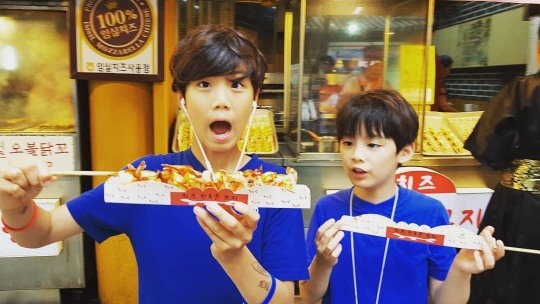 10일 류진은 자신의 인스타그램을 통해 "찬브로 한옥마을 여행~ 아빠는 맛도 못봤다 #찬형찬호 #전주한옥마을 #새우꼬치 #문어꼬치"라는 글과 함께 한 장의 사진을 게재했다.