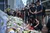 홍콩 도심 애드미럴티의 유명 쇼핑몰 퍼시픽 플레이스 4층 외벽에서 '범죄인 인도 법안'(일명 송환법)에 반대하는 고공농성을 벌이다 15일 오후 바닥으로 떨어져 숨진 30대 남성을 추모하기 위해 많은 시민들이 16일 추락 장소를 찾아 꽃다발을 놓고 명복을 빌고 있다. <사진=AFP연합> |
