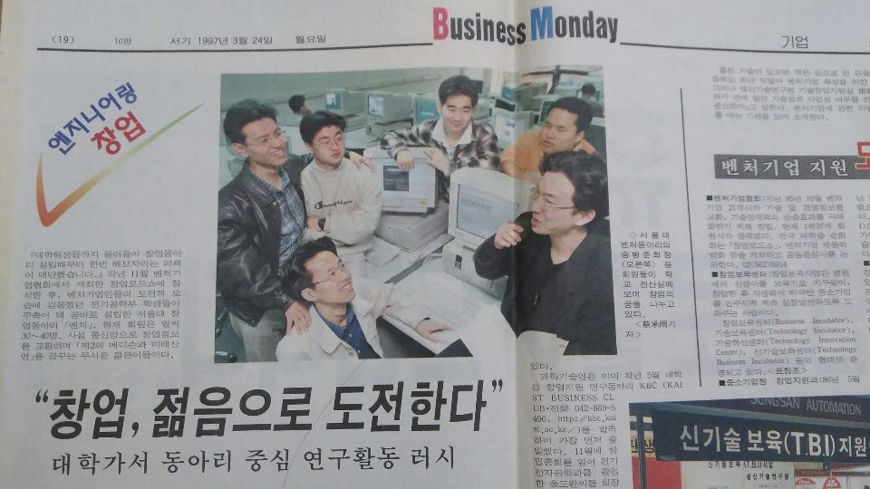 < 1997년 서울대 창업동아리를 다룬 신문 기사, 지면 속 사진 아래 석 대표의 모습이 보인다, 출처: 조선일보 >
