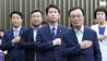 더불어민주당 이해찬 대표(앞줄 오른쪽)와 이인영 원내대표(가운데) 등 의원들이 17일 오후 국회에서 열린 의원총회에서 국기에 경례하고 있다./연합뉴스 |