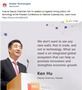 이 광고에는 '우리는 새로운 장벽을 보고 싶지 않다. 무역이나 기술에서 그렇다. 우리가 필요한 것은 통합된 글로벌 생태계다'라는 후허우쿤(胡厚崑) 화웨이 부회장의 발언이 인용돼 있다.