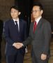 김정한 외교부 아시아태평양국장(왼쪽)이 5일 도쿄 외무성 청사 현관에서 맞이하러 나온 가나스기 겐지(金杉憲治) 일본 외무성 아시아대양주국장과 악수하고 있다. [연합뉴스] |