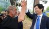 김승환 전북교육감 당선인이 지난해 6월 지방선거 직후 전북 전주시 롯데백화점 사거리에서 문규현 신부와 올리며 당선의 기쁨을 나누고 있다. [뉴스1] |