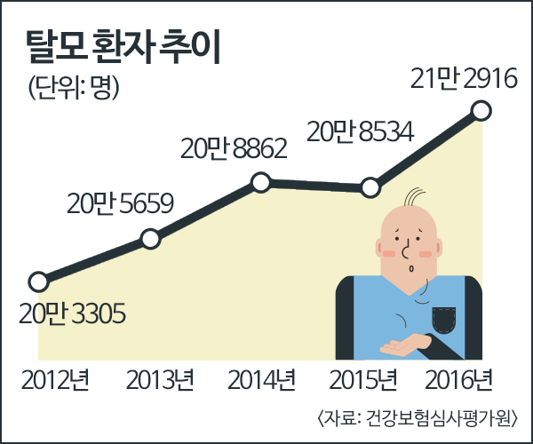 22일 국민건강보험공단 통계에 따르면 지난 5년간 탈모로 인한 진료 인원이 103만 명으로 매년 증가하고 있다. 탈모 환자 인구가 갑자기 늘어나는 이유는 외모에 관심이 커지면서 탈모를 자각해 병원을 찾는 환자가 늘어난 데다 다이어트, 스트레스, 식습관 변화 등으로 특히 20~30대 젊은 탈모 환자들이 증가한 것으로 볼 수 있다.