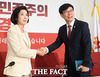 김상조 신임 청와대 정책실장이 27일 오후 서울 여의도 국회에서 나경원 자유한국당 원내대표(왼쪽)를 만나 인사를 하고 있다. / 국회=배정한 기자 |