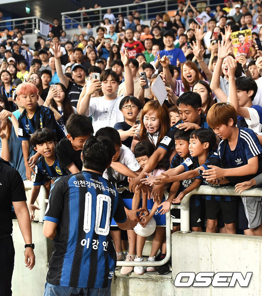 [OSEN=인천, 박재만 기자] 30일 오후 인천시 중구 인천축구전용경기장에서 '하나원큐 K리그1 2019‘ 인천 유나이티드와 강원FC의 경기가 열렸다. 경기 하프타임 U-20 월드컵 국가대표 이강인이 팬들에게 사인 공을 주고 있다. /pjmpp@osen.co.kr