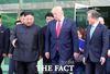 문재인 대통령과 김정은 북한 국무위원장, 도널드 트럼프 미국 대통령이 30일 경기 파주 판문점 공동경비구역(JSA) 자유의 집에서 회담을 마친 뒤 대화를 나누며 나오고 있다. /판문점=뉴시스 |