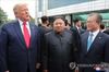 ![판문점에서 만난 남·북·미 정상 (서울=연합뉴스) 김정은 북한 국무위원장과 도널드 트럼프 미 대통령은 판문점 회동에서 교착 상태인 북미 대화를 재개하기로 합의했다고 조선중앙통신이 1일 보도했다. 판문점 남측 자유의집 앞에서 대화하고 있는 문재인 대통령과 김정은 국무위원장, 트럼프 대통령의 모습. 중앙통신이 홈페이지에 공개한 사진. 2019.7.1