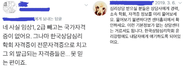 반면 상담심리사와 비슷한 업무를 진행하는 ‘심리상담사’는 상담 경험이나 수련 없이도 비교적 손쉽게 해당 자격증을 취득할 수 있다. 한국심리상담협회가 만든 ‘심리상담사’ 자격증은 18세 이상 성인이 필기시험에서 평균 60점 달성 후 단기 직무교육을 이수하면 취득할 수 있다. 지난 2015~2018년까지 한국심리상담협회가 발급한 ‘심리상담사’ 자격증은 총 1만1,005개다. 한국심리상담협회 관계자는 “심리상담사는 독학으로도 딸 수 있다”며 “상담 경험을 쌓으려면 주위 가족들을 상담해 보거나 복지관에서 일하는 방법이 있다”고 말했다. 아울러 “규제사항이 딱히 없어 상담 경험이 부족해도 자금이 있으면 심리상담소 개소는 할 수 있다”고 밝혔다. 한국자격증정보원이라는 기관이 운영하는 ‘심리상담사’ 자격 역시 필기시험 통과 후 직무교육만 이행하면 취득할 수 있다.