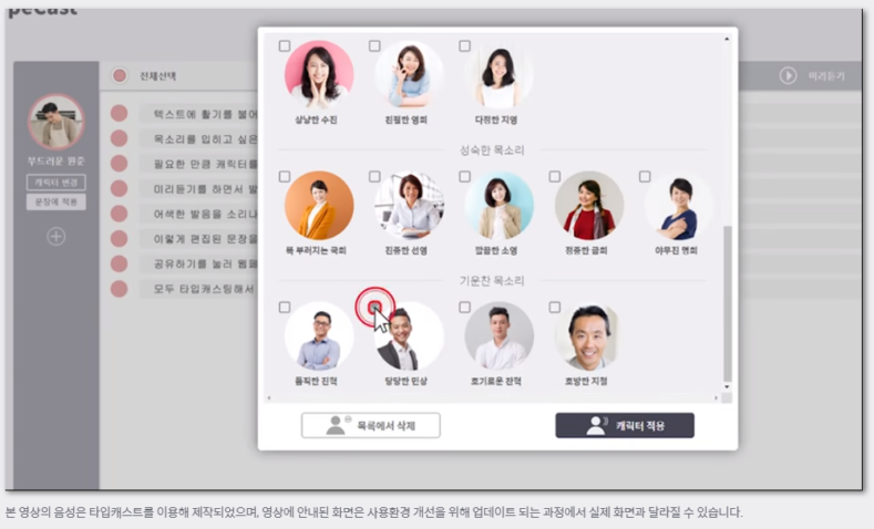타입캐스트는 유명인 외에 기자, 노인까지 20개 이상 인공지능 음성을 제공한다. 네오사피엔스 측은 앞으로도 다양한 음성과 기능을 추가해 오디오 콘텐츠를 만들려는 사용자를 확보할 것이라고 밝혔다. 현재 타입캐스트 베타 버전은 홈페이지에 접속하면 누구나 이용할 수 있다.