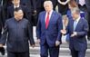 김정은 북한 국무위원장이 지난 30일 판문점 남측 자유의 집에서 도널드 트럼프 미국 대통령과 회동을 마친 뒤 문재인 대통령 등과 함께 군사분계선으로 이동하고 있다. 판문점=연합뉴스 |