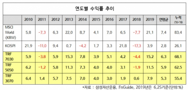 KODEX TRF 연도별 수익률 추이 ‘TRF 3종’ 시리즈 펀드는 투자자 본인이 감당할 수 있는 리스크의 종류와 크기 등에 따라 포트폴리오(자산구성)를 정할 수 있어 자기가 구상하는 재무 목표를 원활하게 달성하는데 목표를 두고 운용한다.