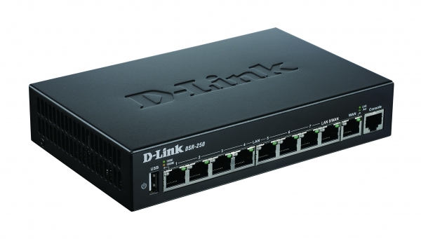 디링크 DSR-250에는 기가비트 LAN 포트 8개와 WAN 포트 1개, 콘솔포트가 내장되어 있어 기가 인터넷 네트워크 구축에 적합하다. 듀얼 WAN 이중화를 지원해 2개의 WAN 포트로 운영할 수 있으며, 원격에서 LAN 브로드캐스트 트래픽을 수신할 수도 있다.