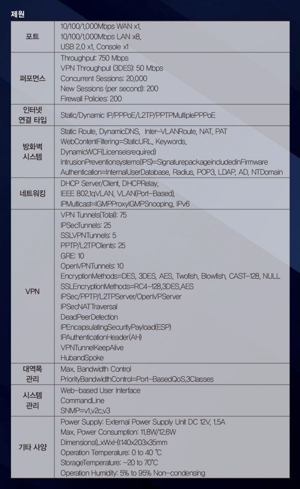 또한, 디링크 D-View 프로그램을 이용해 VPN 네트워크를 통합관리할 수 있다. 대시보드를 통해 디바이스의 상태를 확인할 수 있어 빠른 대처가 가능하다. 파일 또는 네트워크 공유를 위한 USB 포트도 있다.