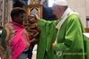 프란치스코 교황이 8일 바티칸 성베드로 대성당에서 난민과 이민자를 위한 미사를 집전한 뒤 이민자 가정의 아이를 쓰다듬고 있다. [AFP=연합뉴스] |