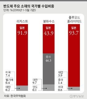 앞서 일본 정부는 지난 4일부터 ▶불소 함유량이 전체 중량의 30% 이상인 불화수소 ▶불소 함유량이 전체 중량의 10% 이상인 플루오린 폴리이미드 ▶1나노(㎚) 초과 193나노 미만 파장의 노광장비(반도체 기판에 회로를 그리는 장비)에 쓰이는 포토레지스트(감광제) 등에 대한 한국 수출 절차를 이전 대비 강화했다. 이전에는 3년간 포괄적 수출 승인을 내줬다면, 4일 이후부턴 수출물량 한 건마다 승인을 받게 했다.