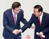 이낙연(왼쪽) 국무총리가 12일 국회 예산결산특위 회의장에서 예결위원장인 김재원 자유한국당 의원과 악수하고 있다. 추경안 심사를 위한 이날 예결위 종합 정책 질의에 국무위원 74%가 불출석 사유서를 냈다가 “추경 처리 의지가 없다”는 야당 비판에 뒤늦게 일정을 조정해 참석했다. /이덕훈 기자 |