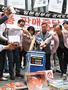 한국중소상인자영업자총연합회 회원들이 15일 서울 종로구 옛 주한 일본대사관 앞에서 '일본제품 판매중단 확대선포 기자회견'을 열고 일본기업 제품을 쓰레기통에 버리는 퍼포먼스를 하고 있다. 이들은 담배 및 주류 위주로 판매중단 운동을 벌이다 13일부터 음료, 조미료 및 소스류 등으로 범위를 확대했다고 밝혔다. 사진= kbs@fnnews.com 김범석 기자