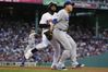 류현진(오른쪽)이 15일 미국 매사추세츠주 보스턴의 펜웨이파크에서 열린 보스턴과의 방문 경기에 선발 등판해 1회초 내야진의 실책성 플레이로 촉발된 위기를 끝내는 수비를 펼치고 있다. 보스턴=AP연합뉴스