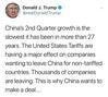 트럼프 대통령은 트위터에 "중국의 2분기 성장률이 27년만에 가장 느리다"며 "미국의 관세는 중국을 떠나 비관세 국가로 가고자 하는 기업들에게 큰 영향을 미치고 있다"고 주장했다.