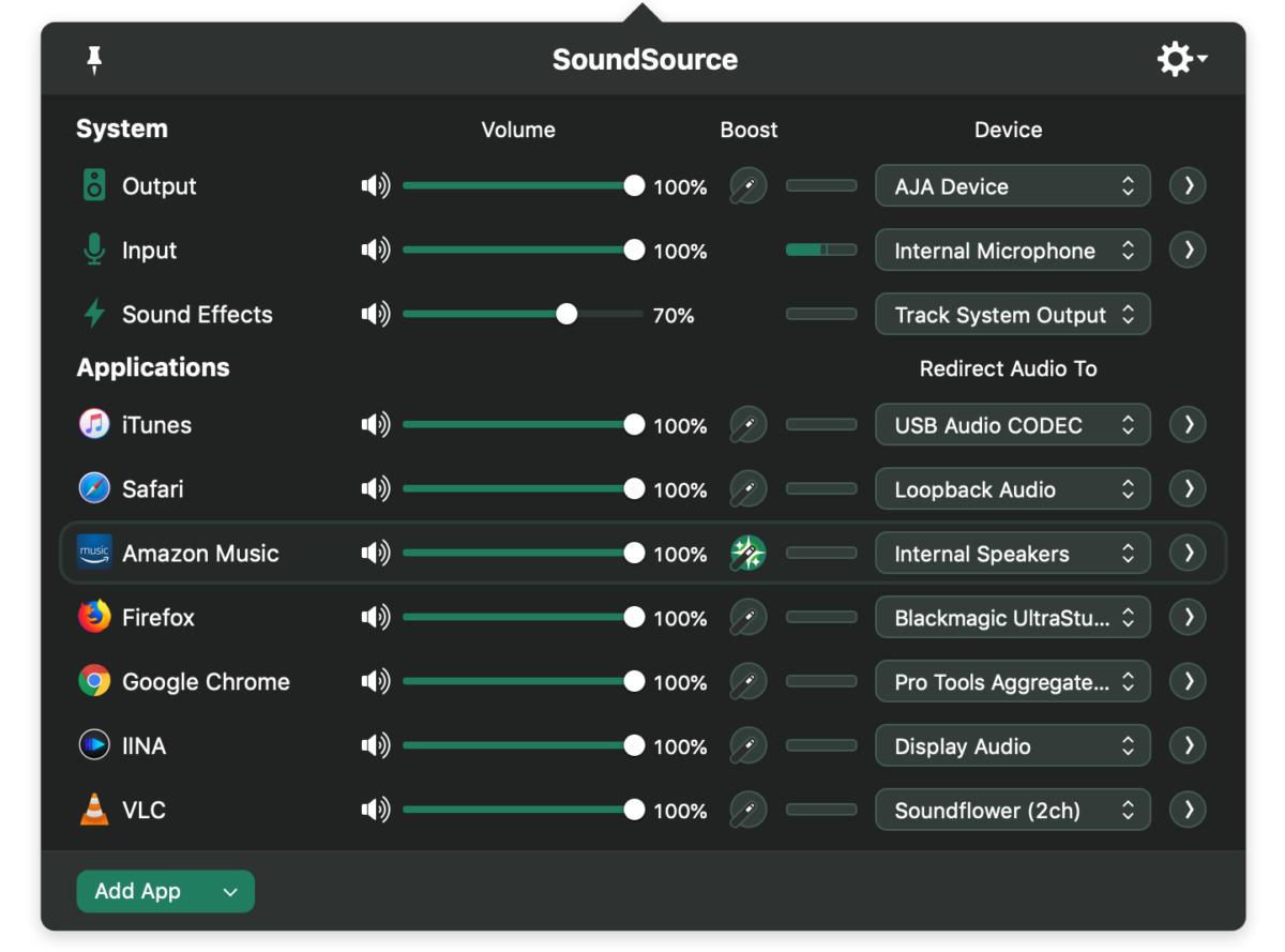 사실 이 정도가 사운드소스의 기능 전부라고 해도 충분히 구매할만하다. 그러나 4.0 버전부터 애플리케이션별로 오디오를 제어할 수 있는 기능이 추가됐다. 이를 이용하면 앱마다 출력을 높이거나 줄이고 혹은 무음으로 할 수 있다. 매직 부스트는 특정 소프트웨어에서만 사용할 수 있지만 앱을 다른 출력으로 바꾸는 것으로 모든 앱에서 가능하다. 이 놀랍고 강력한 추가 기능은 사운드소스를 설치했을 때 다양한 앱을 자동으로 구성해 사용할 수 있다. 물론 다른 앱도 쉽게 추가할 수 있고 드래그 앤드 드롭으로 원하는 대로 아이콘을 정렬할 수 있다.