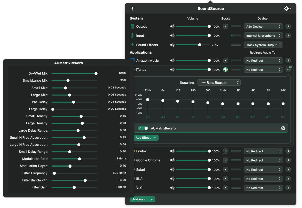 더 멋진 기능은 각 출력에 10밴드 이퀄라이저와 밸런스 슬라이더를 지원한다는 점이다. 또한 오디오 유닛 효과를 적용할 수 있어, 이미 AU 플러그인을 설치했다면 사운드소스 4에서 바로 사용할 수 있다. 이퀄라이저에는 기본적으로 20개 이상의 프리셋이 포함돼 있고 사용자가 원하는 대로 만들어 추가할 수도 있다. 이러한 고급 기능 설정은 창을 열자마자 바로 나타나지 않는다. 기기와 애플리케이션별로 오른쪽 화살표 아이콘을 클릭해야 나타난다. 또한, 이 소프트웨어를 사용하면 입력과 출력 샘플 레이트 사이를 전환하기도 쉽다. 단, 출력 샘플 레이트가 48Hz로 고정된 특정 비디오 하드웨어는 그 설정만 가능하다.