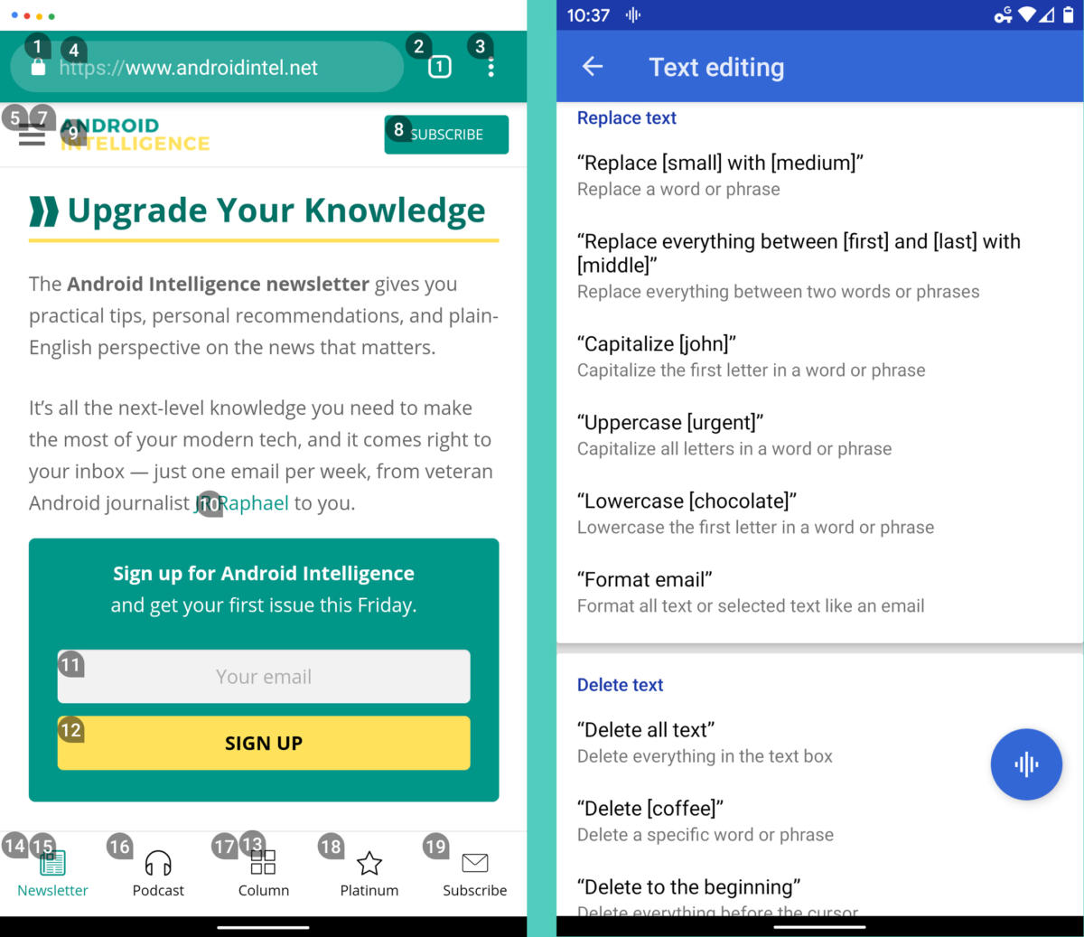 간단하고 단순한 보이스 액세스는 단순히 말하는 것만으로 휴대폰 사용 경험의 모든 부분을 제어할 수 있게 해준다. 일단 시스템을 작동하면, 이전 화면으로 돌아가라든지 홈으로 돌아가라든지 휴대폰 설정의 모든 요소를 조정할 수 있다. (어색한 제스처는 필요 없다!) 항목을 길게 누르고, 항목을 어떤 방향으로 스크롤하고, 텍스트를 선택하거나 선택 취소하고, 원하는 위치에 커서를 놓도록 요청할 수 있다. 텍스트 편집도 할 수 있고 영리한 화면에서의 번호 매기기 시스템을 통해 손가락 하나 까딱하지 않고 앱과 웹사이트를 돌아다닐 수 있다.