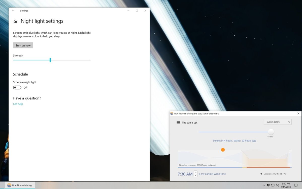 디스플레이 온도를 더 세밀하게 조정하고자 한다면 무료 앱인 F.lux를 사용해보자. 야간 모드에 색온도를 조정하는 슬라이더가 한 개만 있는 윈도우 자체 기능과는 달리 낮, 해가 질 때, 밤에 각각 다른 수준으로 설정할 수 있다.