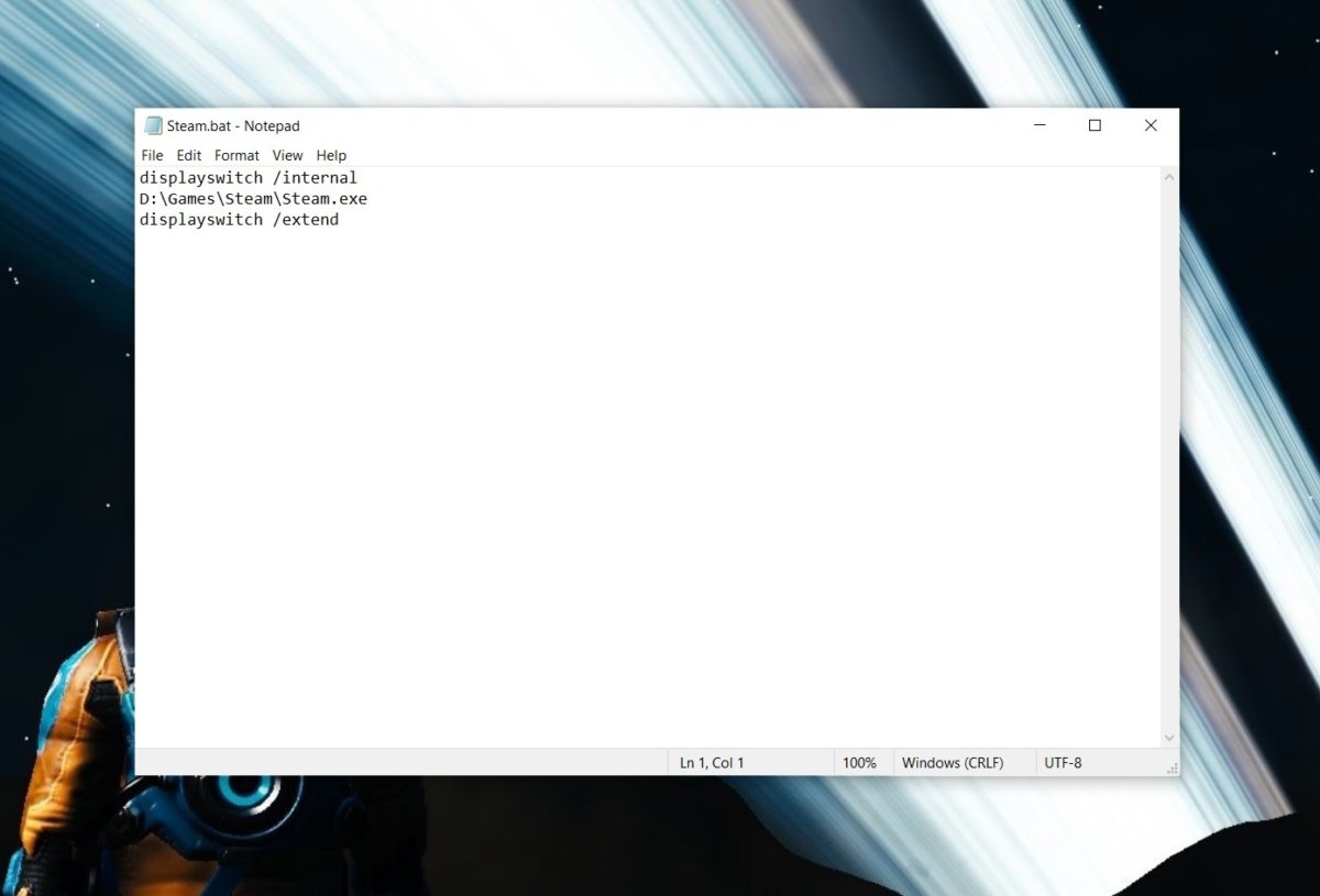 마지막 팁은 조금 과할 수도 있지만, 다중 모니터 설정시 특정 앱을 실행했을 때 보조 모니터를 자동으로 꺼주는 설정이 가능하다. 시야에 방해를 받지 않고 글쓰기나 게임에 집중하고 싶은 경우에 유용하다. 모니터의 전원 버튼을 누르거나 윈도우키+P 단축키를 사용할 수도 있지만 자동화해두면 훨씬 편할 것이다.밸브(Valve)의 스팀(Steam) 런처를 예로 들자. 아무 디렉토리에서나 텍스트파일을 만드는 것으로 시작한다. 스팀이 설치된 디렉토리도 무방하다. 텍스트 파일에는 다음과 같은 내용을 넣어야 한다.