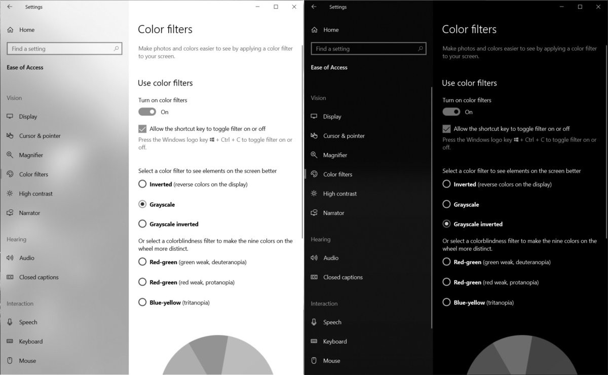 일을 할 때 시작 메뉴나 작업표시줄에 있는 형형색색의 앱 아이콘들이 유혹해서 소셜 미디어를 켜거나 이메일을 열어 시간을 낭비할 수도 있다. 디스플레이를 그레이스케일 모드로 설정해서 이런 유혹을 물리칠 수 있다.윈도우 10에 내장된 그레이스케일 모드를 활성화하려면 설정 > 접근성 > 색상 필터로 이동해서 ‘색상 필터 켜기’ 토글을 활성화한다. 그리고 아래의 필터 선택지 중에서 ‘회색조’을 선택한다. 이 설정을 바로 켜고 끌 수 있는 단축키도 사용할 수 있는데 ‘필터를 설정/해제하는 바로 가기 키 허용’에 체크한다. 그러면 윈도우 키+Ctrl+C를 눌러 바로 그레이스케일 모드로 변경할 수 있다.