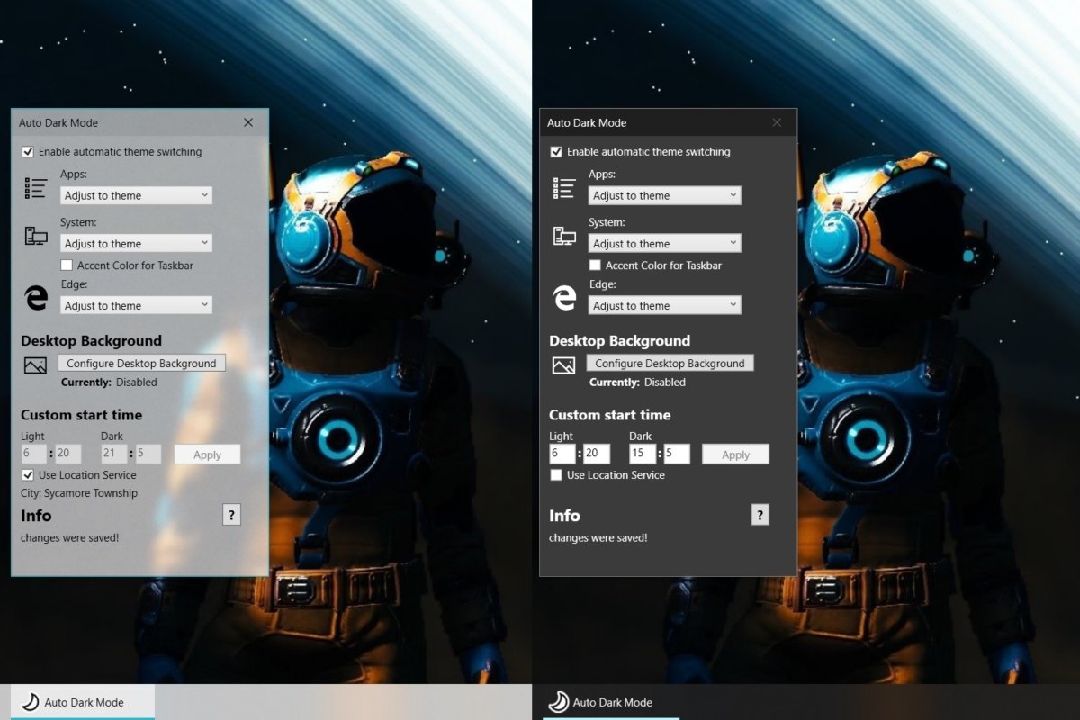 무료로 제공되는 윈도우 10 오토 다크 모드 앱(Windows 10 Auto Dark Mode app)을 사용해보자. 시간에 따라서 라이트와 다크 모드를 자동으로 바꿔준다. 직접 시간대를 설정하거나 위치에 기반해서 일출, 일몰 시간에 맞춰 자동 조정되게 할 수도 있다. 오토 다크 모드는 각 모드의 배경화면을 따로 설정할 수도 있다.