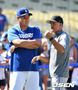 [OSEN=로스앤젤레스(미 캘리포니아주), 지형준 기자]경기에 앞서 다저스 류현진이 마이애미 트레이 힐만 코치(전 SK 감독)와 인사를 나누고 있다. /jpnews@osen.co.kr |