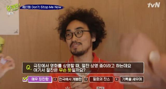 이날 퀴즈로는 '절찬 상영 중 절찬은 무슨 뜻 일까요?'가 출제돼다. 보기로는 1. 매우 칭찬함 2. 전국에서 개봉한 3. 절호의 찬스 4, 기록을 세우면이었다.
